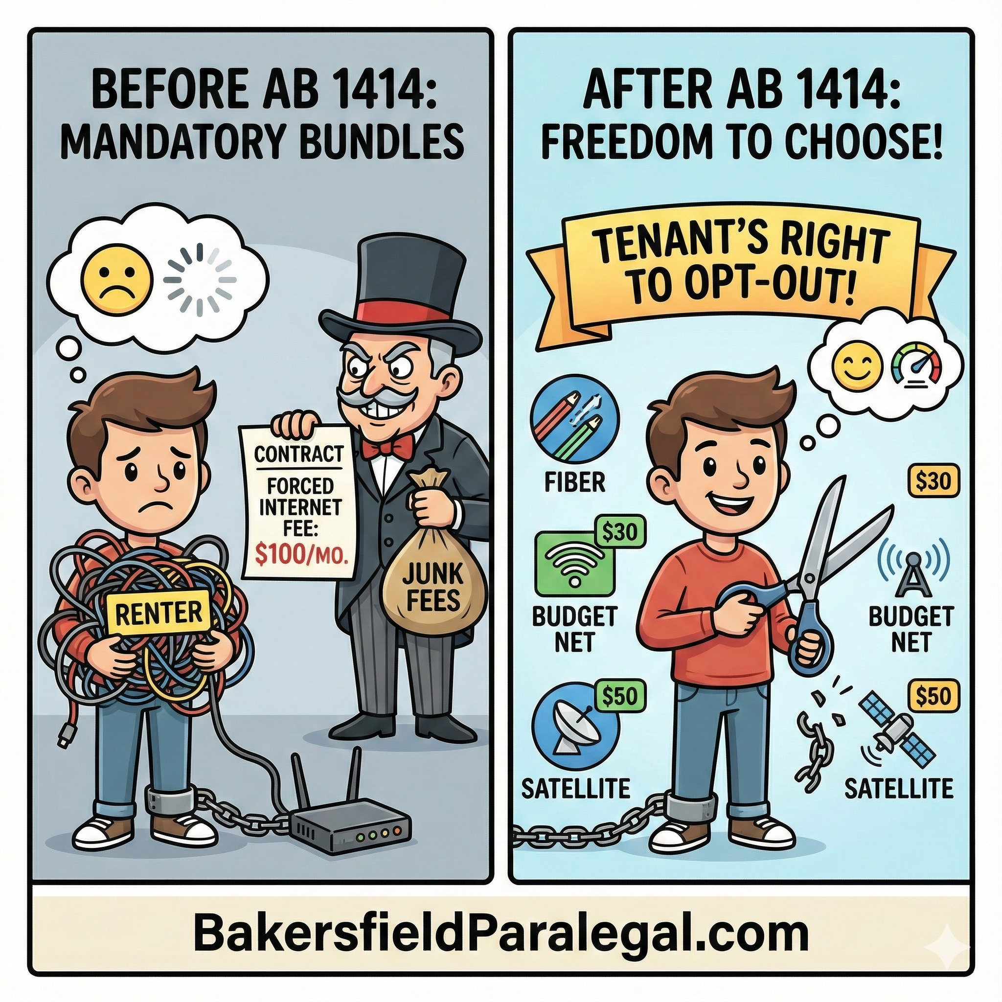 - Choice Mandate: For any tenancy starting or renewing on or after January 1, 2026, landlords must allow tenants to opt out of paying for any subscription from a third-party ISP (wired, cellular, or satellite) offered as part of the lease.