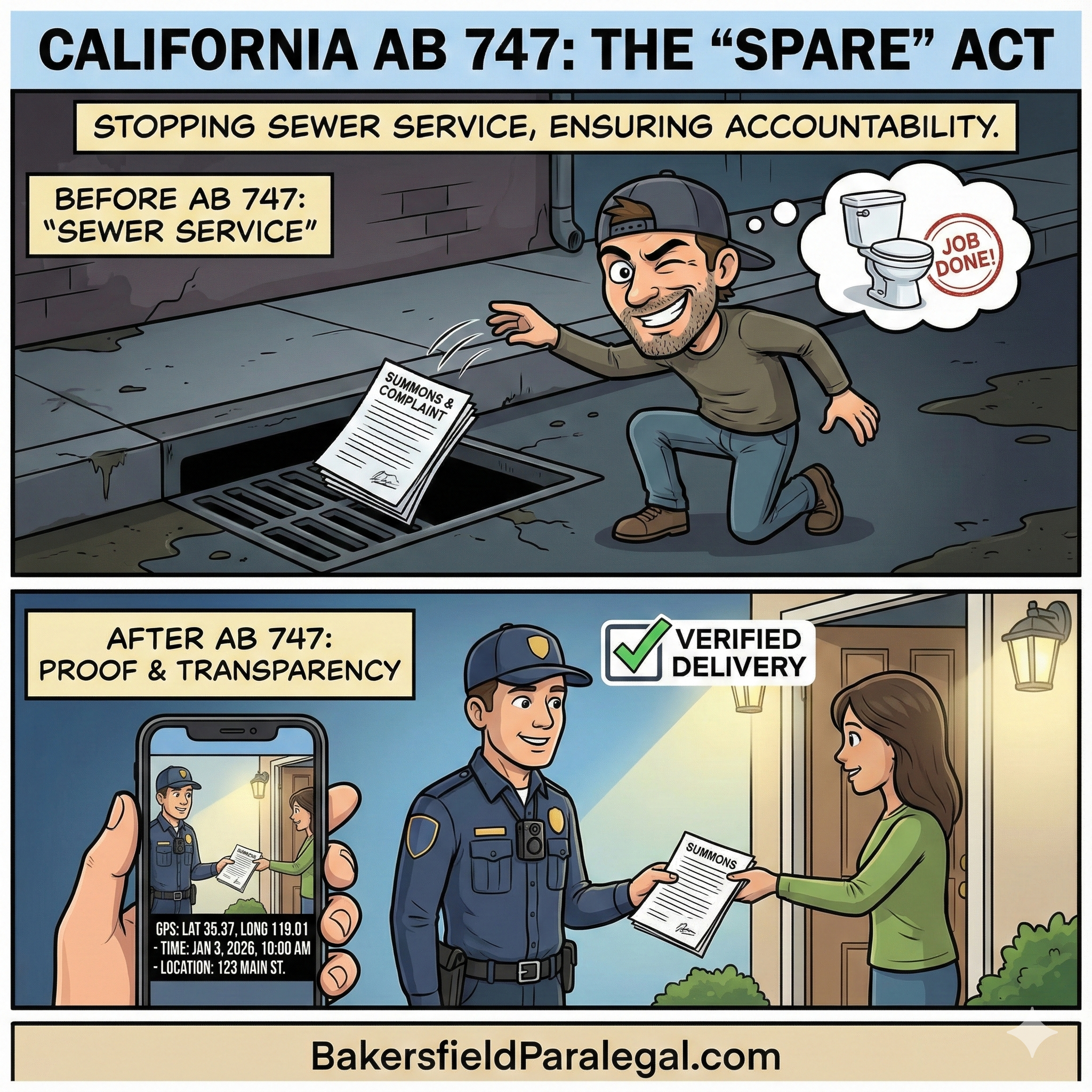 Overview: This landmark legislation reforms how legal documents are served in California. It targets the practice of “sewer service”—where process servers falsify records without actually delivering documents—to ensure defendants have a fair opportunity to defend themselves in court.